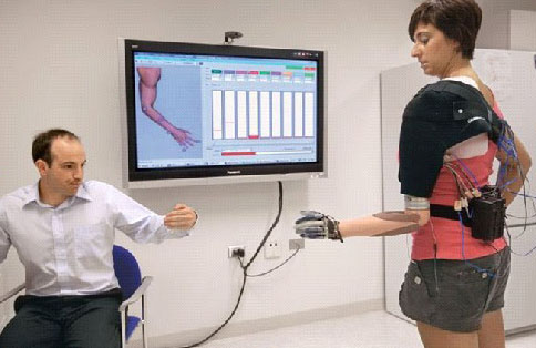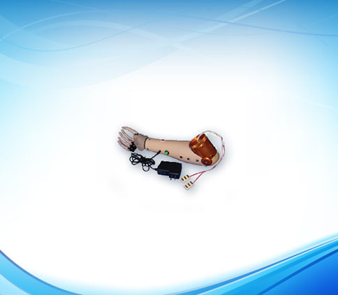 肌电上肢假肢:这是一种纯体外力源驱动的假肢。假肢上装有电池,它为假肢的运动提供能量。截肢者通过有意识的收缩残肢肌肉,可以在残肢皮肤表面产生一种微小的电位差,利用这个电压,可以控制假手的张开、闭合和旋转等功能。