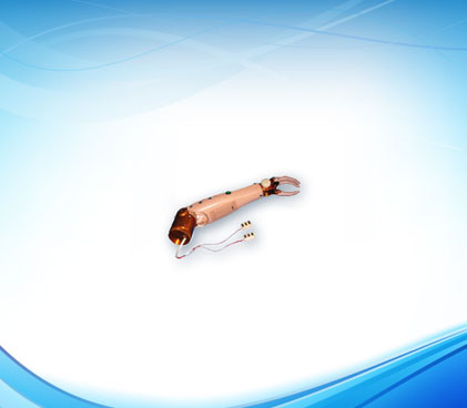 肌电上肢假肢:这是一种纯体外力源驱动的假肢。假肢上装有电池,它为假肢的运动提供能量。截肢者通过有意识的收缩残肢肌肉,可以在残肢皮肤表面产生一种微小的电位差,利用这个电压,可以控制假手的张开、闭合和旋转等功能。