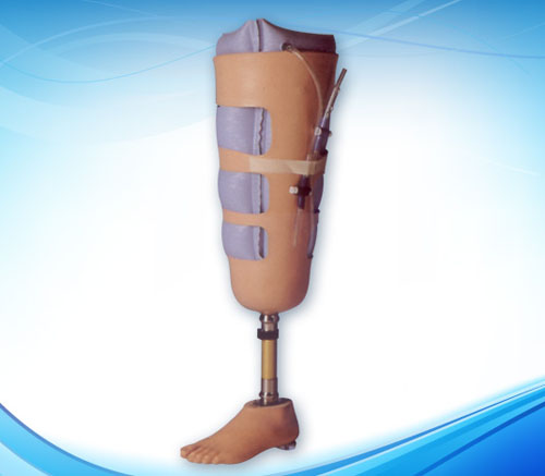 小腿假肢分壳体式和骨骼式两种,壳体式假肢接受腔与残肢适配性差,穿戴不方便,重量重。骨骼式小腿假肢各零部件可根据患者的不同需要加以组装,以达到最佳的使用效果,假肢承重合理步态自然。接受腔一般采用PTK口型,经济条件好的可选择更先进的硅胶制锁接受腔,其悬吊性更好,穿着更舒适。依据残肢者健肢侧的形状用弹性泡沫制成装饰外套,起美观和仿真作用。对于小腿截肢者安装假肢时最重要的是选择合适的脚板。其次,依据残肢长短选择合适的假肢部件和材料。小腿假肢一般均可达到同正常人一样的步态,行动自如,可使用各种劳动工具,可骑车,跑步,负重等均可完成。